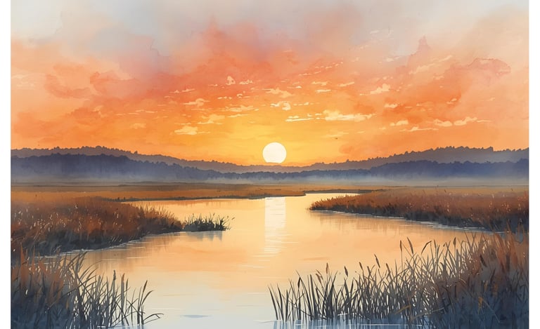 Monochrome depiction of tranquil waters with the radiant sun above reflecting off the surface